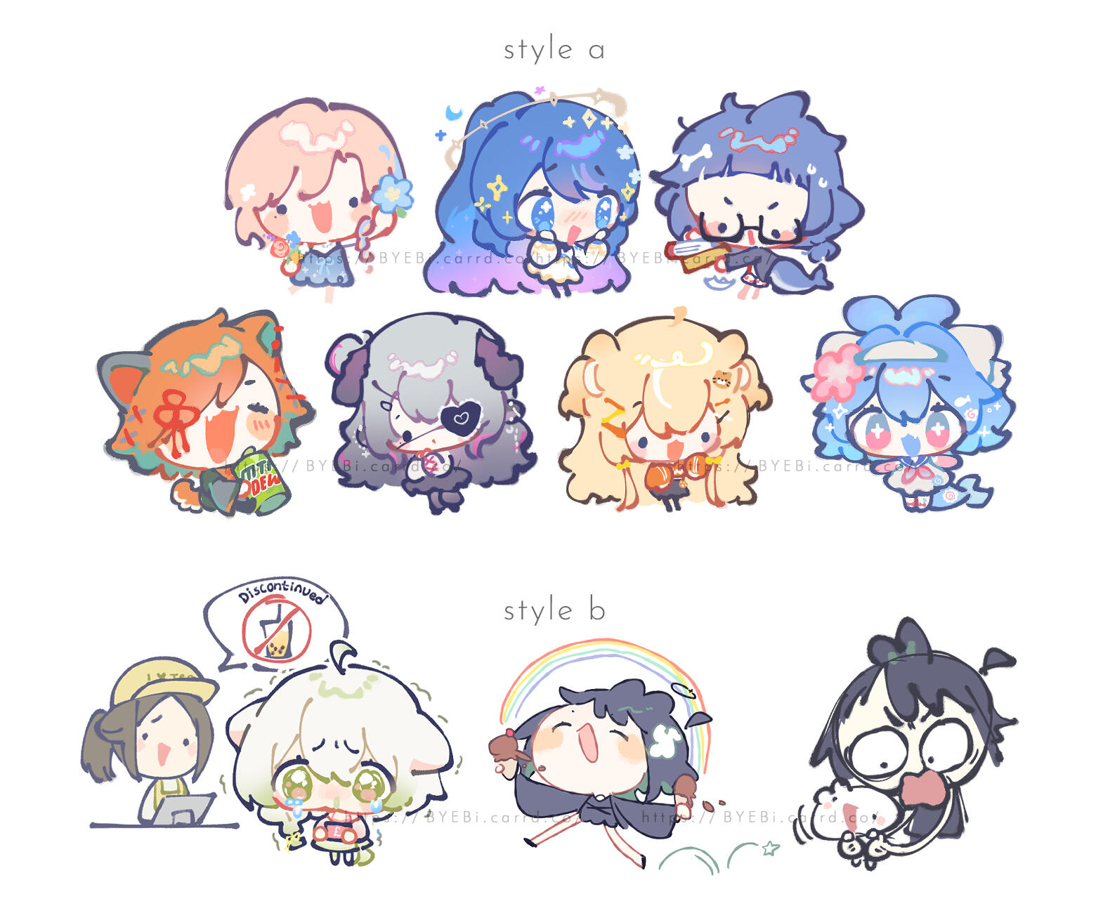 Style A: vibrant colors, fluffy and cute, sticker vibesStyle B: good for reactions / storytelling, exaggerated- details/colors may be changed from ref to fit style